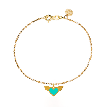 Uskrzydlone Serca- bransoletka złota z sercem w kolorze niebiańskiego błękitu